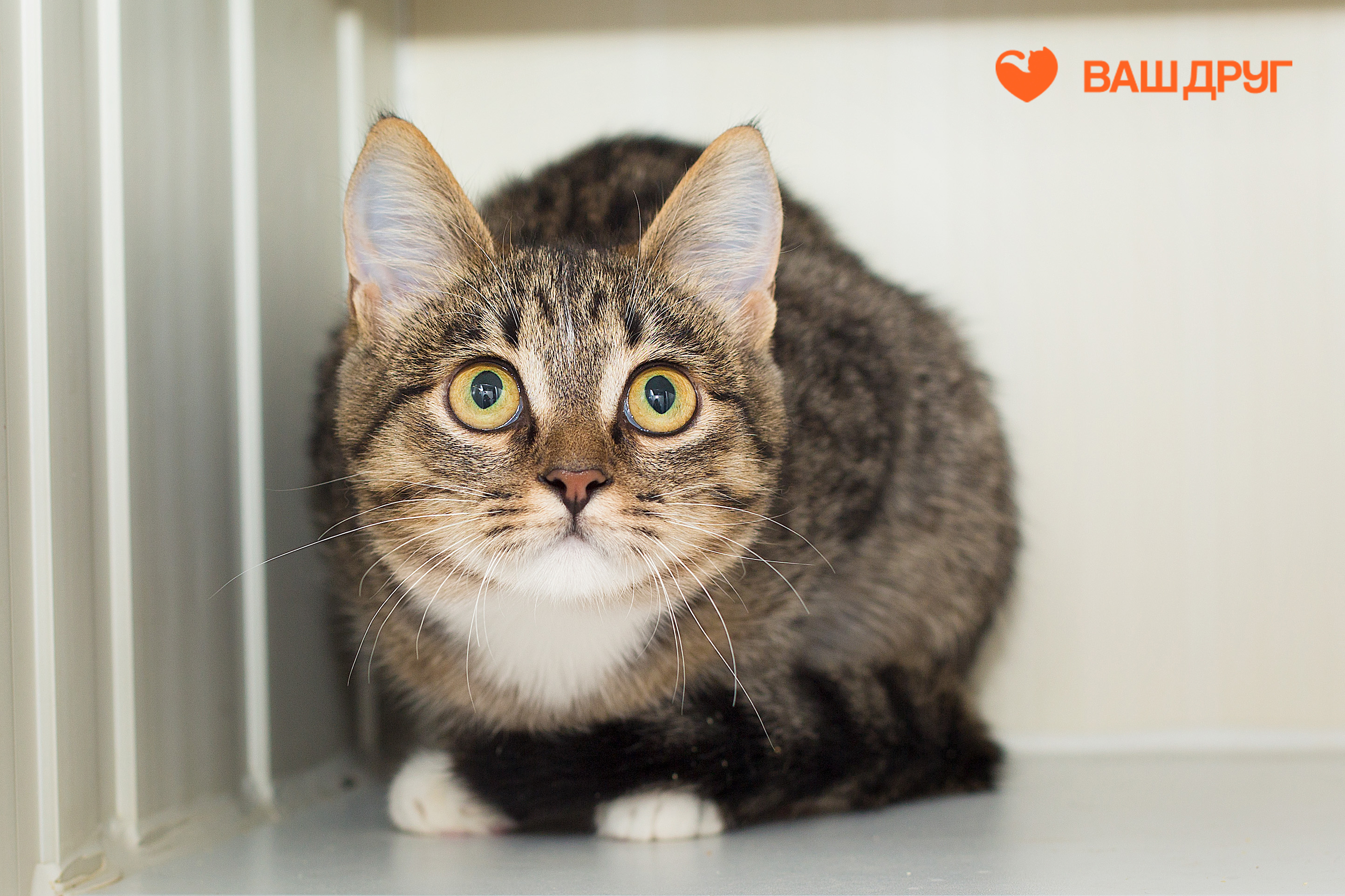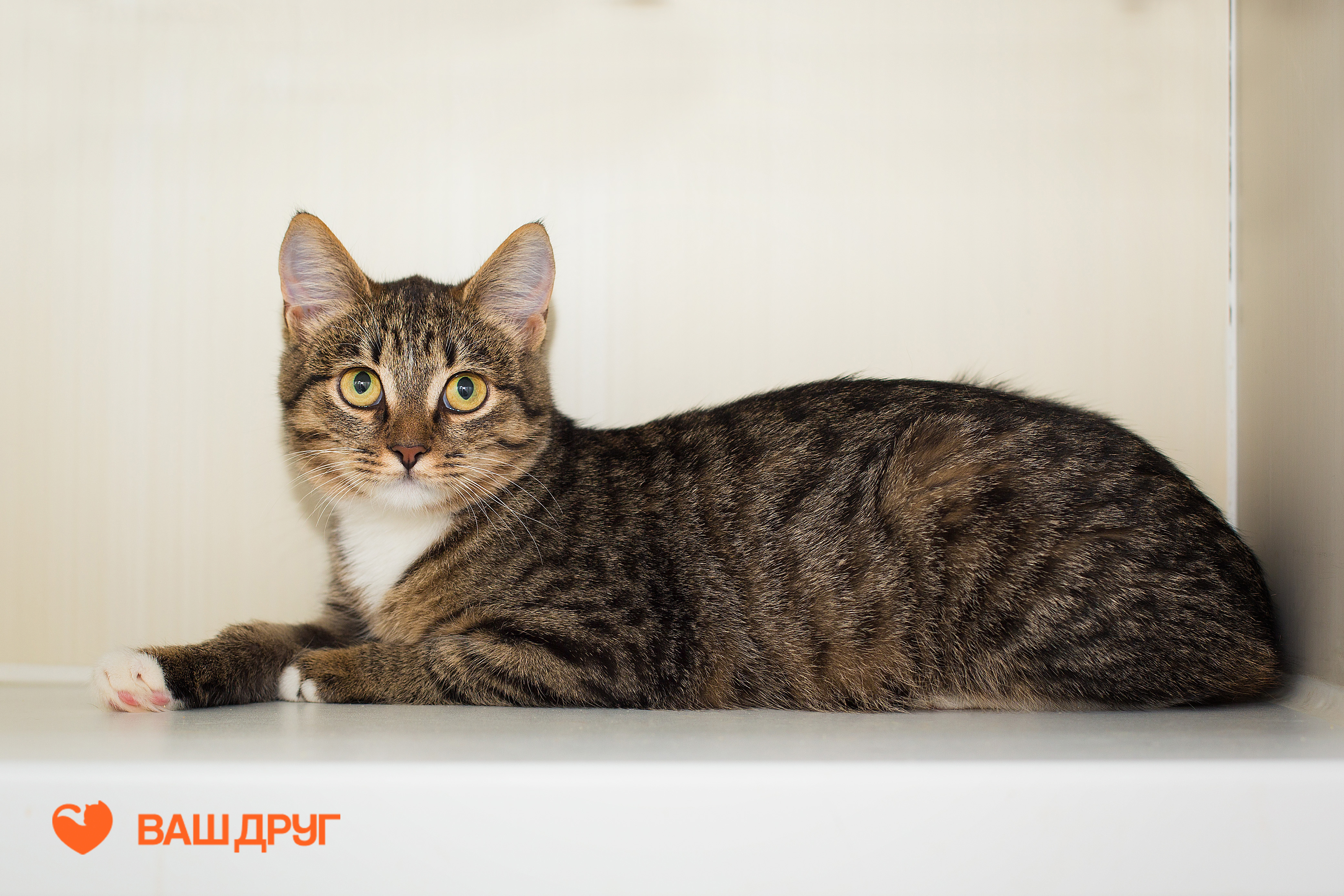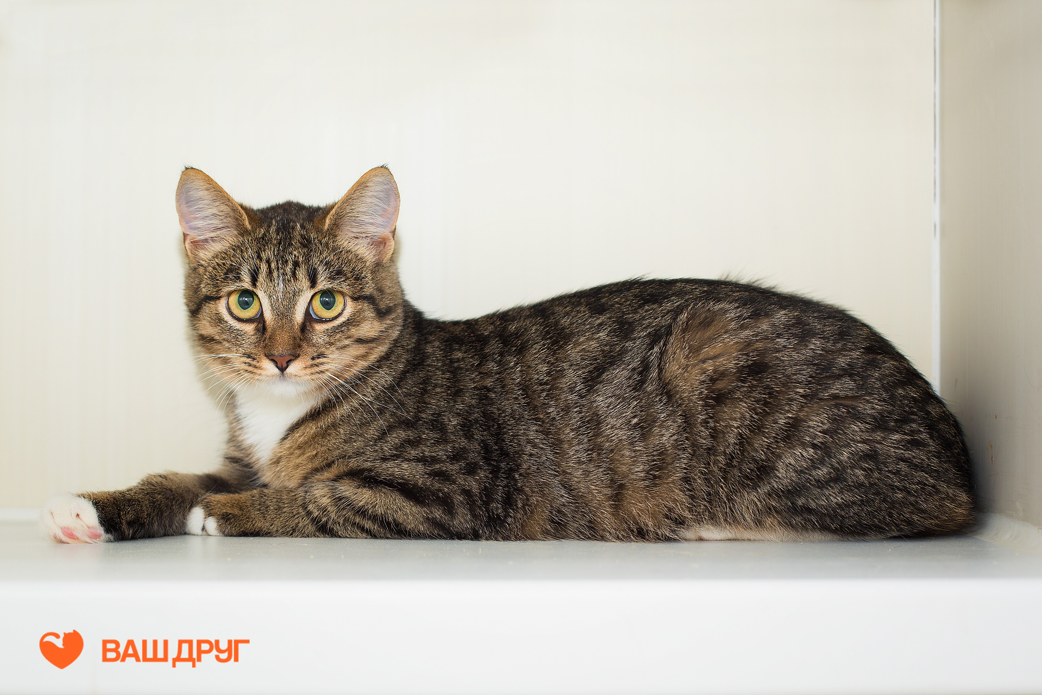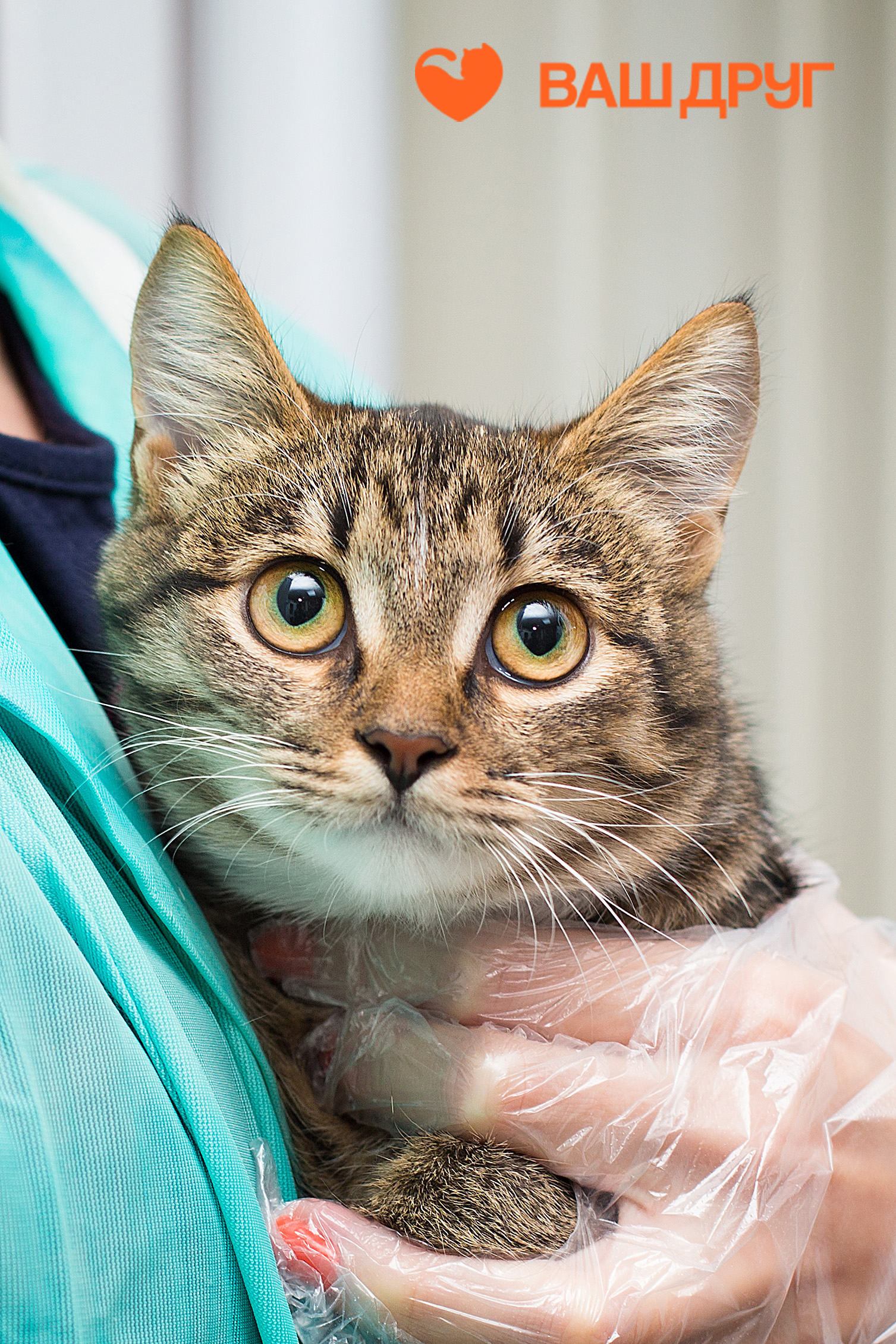 Очень ласковая, терпеливая зайка. Одна из котят, спасенных с закрытой территории магазина. Был обнаружен перелом передней лапки.